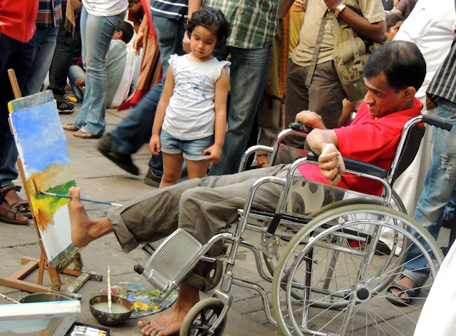 I also saw a handicapped person painting with his foot. His muscles were twisted and had not grown properly. Yet, it was amazing to see how beautifully he painted. When any of us draw a tree, we will draw two straight lines and leaves. Because he was painting with his foot, the lines went crooked and it gave the real shapes and textures of a tree.
